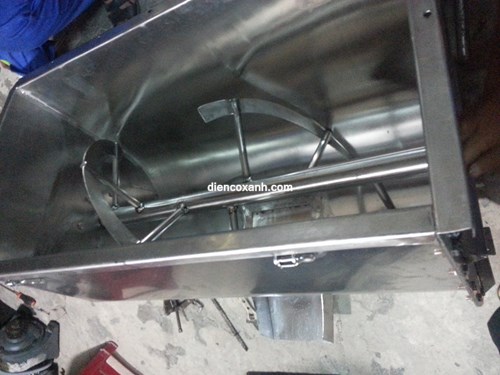 - Cấp nguồn điện, đảm bảo nguồn điện đúng điện áp và và khởi động máy, đảm bảo cánh trộn không bị vướng, cánh trộn được thiết kế gắn trên trục dài xuyên suốt thùng trộn gồm 2 cánh xoắn dạng trục vít ngược chiều lồng vào nhau;