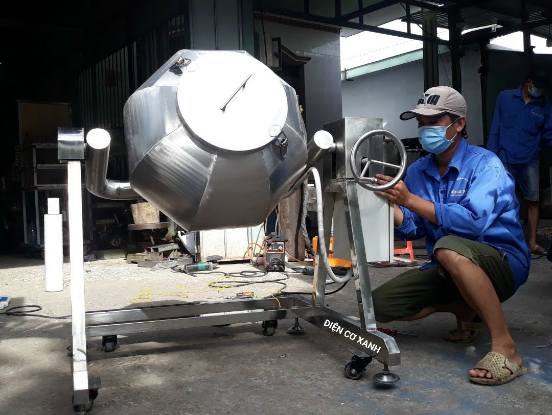 Máy trộn thực phẩm lồng quay dạng khía Điện Cơ Xanh được chế tạo từ inox 304 chất lượng, chuyên cho ngành thực phẩm.